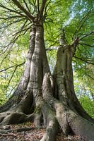 De Veluwezoom staat bekent om haar prachtige bossen waaronder de mooie beukenbossen. Oude beuken staan massaal in een dichtbegroeid groen overdekt bos. Deze foto is genomen in de lente met een groothoek. vanaf de wortels recht omhoog. Het bijzondere aan deze foto zijn de twee beuken uit één onderstam.
