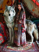 Reuzenwolf met een vrouw die boheemse jurk draagt