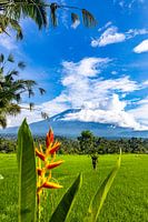 Tijdens een mooie zonnige dag op Bali heb ik deze mooie bloem als voorgrond gebruikt, op de achtergrond zie je de Agung vulkaan en daar tussen in zie je de mooie groene rijstvelden