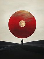 Een eenzame figuur staat voor een enorme rode cirkel waarin een volle maan gloeit. De uitgestrektheid van het tafereel roept een gevoel van kosmische verwondering op, waarbij de figuur in het niet valt bij het hemellichaam. Dit minimalistische werk spreekt tot de connectie tussen de mensheid en het universum en verkent thema's als isolatie, introspectie en de mysteries van de kosmos.