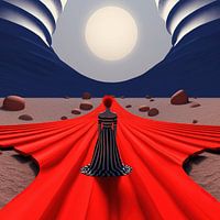 Een vrouw in een rode jurk loopt over een rode loper in een woestijn met een volle maan op de achtergrond, waardoor een contrast ontstaat tussen elegantie en wildernis.