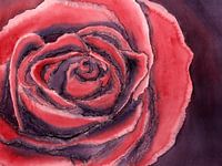 Dit aquarelschilderij is op een bijzondere manier tot stand gekomen. Het is een collage van verschillende lagen aquarel papier over elkaar heen die pas daarna geschilderd zijn. Dit geeft het schilderij van dichtbij een ruig uiterlijk, terwijl het van een afstand juist de delicate, bijna realistische close up/macro afbeelding van een roos lijkt.