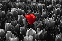 Er stond een tulp tussen geelrode tulpen. Reden voor mij om de foto zwartwit te maken en de rode tulp er uit te lichten.