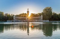 De roeivijver van het park Retiro en het monument voor Alfonso XII in Madrid tijdens zonsopgang.