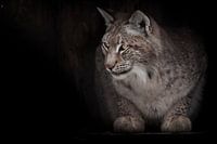 De roodachtige lynx kijkt met belangstelling in de duisternis, een sierlijke ironische kat.
