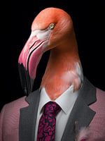 Een surrealistische ontmoeting tussen de natuur en de zakenwereld wordt gepresenteerd in dit indrukwekkende kunstwerk. De flamingo, normaal een bewoner van tropische wateren, is getransformeerd in een gedistingeerde zakenman. Zijn natuurlijke schoonheid blijft volledig intact - het zijdeachtige verenkleed glinstert in warme koraalkleuren die variëren van zachtroze tot levendig oranje.