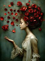 Stap binnen in een wereld van tijdloze schoonheid en surrealisme een betoverend olieverfschilderij waarin een vrouw centraal staat. Haar serene profiel, met gesloten ogen en een kalme uitdrukking, straalt rust en gratie uit. Haar weelderige haar vloeit over in een explosie van dieprode rozen, waarvan de bloemblaadjes zachtjes rond haar dwarrelen – als een stille poëzie in beeld.