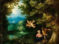 Jan Brueghel de Oude verbleef enige jaren in Rome en werkte daar regelmatig samen met de Duitse kunstenaar Hans Rottenhammer. In dit landschap rusten Jozef en Maria uit tijdens hun vlucht naar Egypte – Maria geeft de kleine Jezus de borst. Het schilderij werd begonnen door Rottenhammer, die de engelen en de heilige familie schilderde. Brueghel nam het vervolgens van hem over en voegde het boslandschap, de bloemen en de ezel toe.