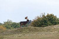 Een donkerbruine damhertbok staat stil voor een struik waarvan de bladeren langzaam verkleuren — van groen naar goud, roest en vuur. Zijn gewei rijst statig omhoog, gevangen in het zachte licht van de herfst. De rust in zijn houding contrasteert met de transformatie om hem heen. Een moment van kracht en kalmte, waarin de natuur haar…