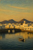 De Tranquil Harbor van Arrecife vangt de sereniteit van Lanzarote bij schemering. Witgekalkte huizen glanzen onder de gouden hemel, hun weerspiegelingen weerspiegeld in het stille water van de haven. Twee kleine bootjes dobberen rustig rond, hun silhouetten zacht tegen het glinsterende licht. De vulkanische heuvels in de verte vormen een zacht contrast en geven het tafereel een tijdloze kalmte.
