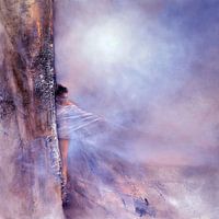 Een jonge vrouw kijkt vanachter een abstract beschilderd vlak naar buiten en houdt een wapperende doek in haar handen. Ze is sierlijk en gracieus, achter haar schijnt de zon fel.