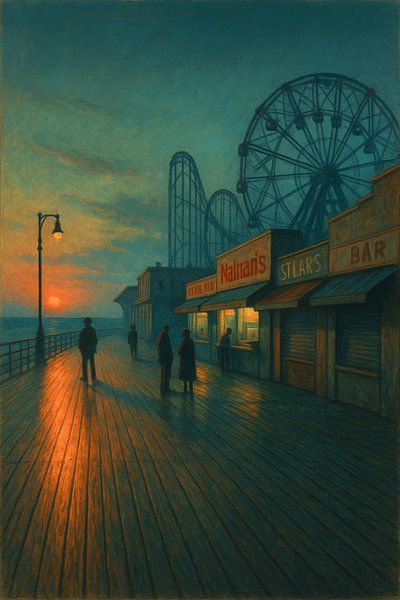 Dit suggestieve en nostalgische schilderij vangt de tijdloze sfeer van Coney Island bij zonsondergang. De scène wordt gedomineerd door de iconische silhouetten van het Wonder Wheel en de Cyclone achtbaan, die groot opdoemen tegen een dramatische, donker wordende groenblauwe en oranje lucht. De beroemde promenade strekt zich in de verte…