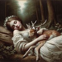 Een digitaal fantasie kunstwerk geïnspireerd door de klassieke schilderijen van vroeger. Een jonge vrouw is in het bos in slaap gevallen samen met een klein hertje in haar armen. Voor een rustgevende en klassieke sfeer in uw interieur.
