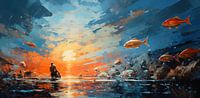 Fantasiebeeld met een zeezicht. In het licht van de zonsondergang het silhouette van een visser en gekleurde vissen in de lucht.