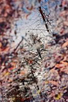 Een weerspiegeling van kale bomen in een regenplas met roodbruine herfstbladeren.