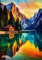 Dit prachtige beeld legt de serene schoonheid van het meer van Braies in Zuid-Tirol, Italië vast. Het smaragdgroene water weerspiegelt de vurige kleuren van de herfsthemel en de ruige toppen van de Dolomieten. Een rustieke houten hut ligt vredig aan de oever van het meer, omringd door hoge groenblijvende bomen. De dramatische bergen op de achtergrond, gedeeltelijk verlicht door gouden zonlicht, voegen diepte en grandeur toe aan de scène. Het rustige meer met zijn betoverende weerspiegelingen creëert een dromerige sfeer, waardoor het een perfecte weergave is van de betoverende schoonheid van het meer van Braies.