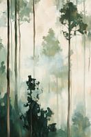 Een mysterieuze mist omhult hoge, slanke bomen die zachtjes glinsteren in verschillende groentinten. Deze harmonieuze compositie straalt rust en natuurlijkheid uit, ideaal voor een slaapkamer of meditatieruimte. De zachte kleurtonen nodigen je uit om je onder te dompelen in een ontspannende time-out en je geest te laten dwalen.