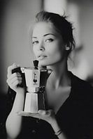 Een elegant zwart-witportret toont een vrouw die een klassieke espressopot in haar handen houdt. Het licht is zacht en modelleert het gezicht en de handen met zachte contrasten, terwijl de achtergrond rustig onscherp blijft. Het glanzende metalen oppervlak van de pot zorgt voor een duidelijk visueel accent. De blik van de vrouw is kalm,…