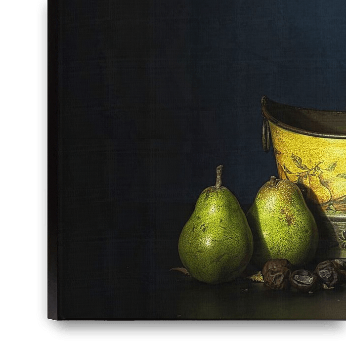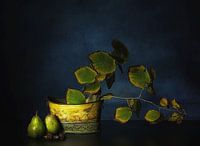 Herfst stilleven met peren een herfsttak in antiek vaas. Makkelijk inpasbaar in de ruimte door zijn ingetogen kleuren en magisch licht .ook geschikt als behang en poster.