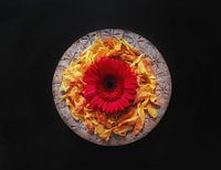 Gerbera op zelf ontworpen keramiek bord en gedroogd blad van pioenroos .