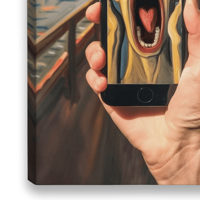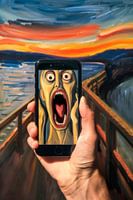 Een indrukwekkend samenspel van traditie en moderniteit: in de ene hand houdt iemand een smartphone vast op het scherm waarop de wanhopige schreeuw van een artistiek wezen in felle kleuren schittert. Op de achtergrond ontvouwt zich een vredig, kleurrijk landschap dat een sterk emotioneel contrast vormt met de wanhopige uitdrukking van…