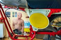 Een foto in de trant van de bekende kalendermeisjes, maar hier zijn het de kalenderjongens. De leerling-monteur wil een Franco Morini motorblok in een Malaguti Cavalcone monteren. Een blik door het frame van deze bijna voltooide brommer. Belangrijke delen van de carrosserie worden bedekt door de motor om de spanning te verhogen…