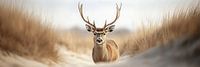 In een rustige duinvallei staat dit gracieuze hert in een intieme pose. Omringd door gouden grassen, lijkt het dier volledig één met zijn omgeving. De zachte kleuren van de achtergrond brengen het hert op de voorgrond, waarbij de subtiele details van zijn vacht en gewei opvallen. Deze foto straalt een gevoel van kalmte en verbondenheid met de natuur uit. Perfect voor aan de muur, brengt het een stukje wilde natuur in je eigen ruimte en herinnert het ons aan de stille kracht en schoonheid die in de natuur schuilt.