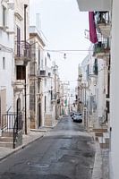 Schoon gewassen wasgoed wappert aan een waslijn in de straat van Ostuni en ruik de pasta geuren terwijl je door de straat struint.