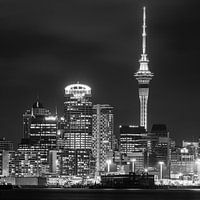 Een vierkante zwart-wit foto met uitzicht op de skyline van Auckland (noordereiland), gezien vanuit Devonport, met de Sky Tower, het hoogste vrijstaande gebouw op het zuidelijk halfrond.