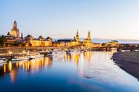 Stadsgezicht van Dresden met Brühlsche Terrasse, Frauenkirche, Kunstacademie, Residenzschloss, Hofkirche, Semperoper en schepen en raderstoomboot op de Elbe bij nacht, Saksen, Duitsland