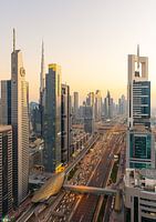 Deze foto legt de futuristische skyline van het centrum van Dubai vast tijdens zonsondergang, gezien van boven de drukke Sheikh Zayed Road. De iconische torens van de stad, waaronder de Burj Khalifa in de verte, steken af tegen een warme gouden lucht die de scherpe contouren van de glazen en stalen architectuur verzacht. Beneden volgen stromen auto's gloeiende lijnen van beweging, die de hartslag van een van de meest dynamische stedelijke centra ter wereld benadrukken. Het beeld weerspiegelt de dubbele identiteit van Dubai: modern en ambitieus, maar toch kalm in het vervagende avondlicht. Ik werd aangetrokken door de geometrie en het ritme van dit uitzicht - de verticale lijnen van wolkenkrabbers weerspiegeld door de horizontale verkeersstroom. De combinatie van technische precisie en sfeervol licht creëert een gevoel van evenwicht tussen energie en sereniteit. Deze compositie viert de menselijke creativiteit en de zich ontwikkelende relatie tussen architectuur, technologie en het woestijnlandschap in het hart van de Verenigde Arabische Emiraten.