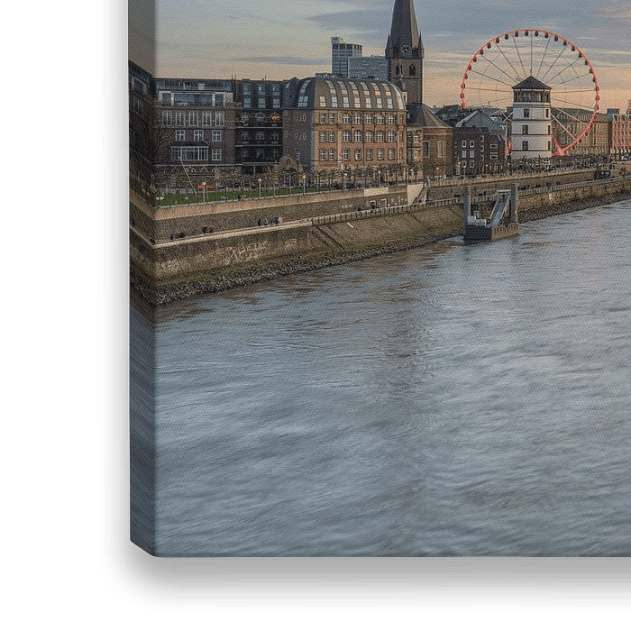 Zicht op de skyline van Düsseldorf vanaf de Oberkasselbrug bij zonsondergang.