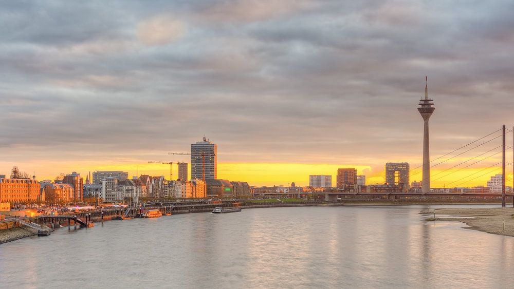 Uitzicht vanaf de Oberkasselbrücke over de Rijn naar de oude stad, de Rijnpromenade en de Mediahaven met de Rijntoren. De ondergaande zon baadt de huizen van de oude stad in een oranje licht.