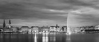 Een panorama foto in Zwart-Wit van een avond aan de Binnenalster, één van de twee kunstmatige meren binnen de stadsgrenzen van Hamburg, Duitsland, die worden gevormd door de rivier de Alster.