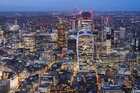 De skyline van het historische financiële district City of London. Het voorste en hoogste gebouw in de foto heeft de bijnaam "The Walkie-Talkie" gekregen vanwege zijn kenmerkende vorm.