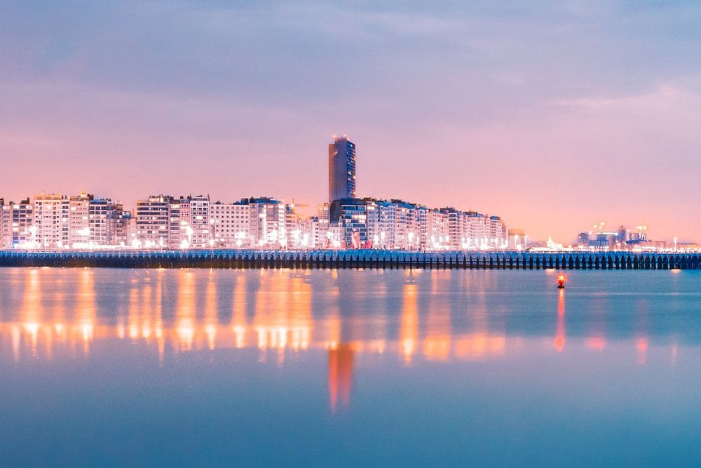 Over deze foto: Nachtopname van de verlichte skyline van Oostende, genomen vanaf de Oostelijke Strekdam. De lange sluitertijd zorgt voor een spiegelglad wateroppervlak wat zorgt voor heel mooie reflecties.