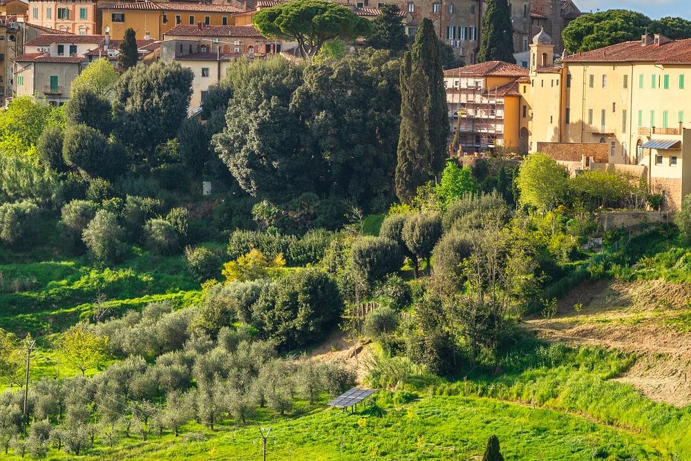 De skyline van het oude dorp Lari, het oude kasteel en het omliggende platteland. Casciana Terme Lari, provincie Pisa, regio Toscane, Italië