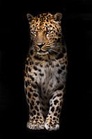 Groot volgelaat. luipaard geïsoleerd op een zwarte achtergrond. Wilde mooie grote kat in de nachteliMichael Semenov Noir Wolf komt recht op je af.Michael Semenov