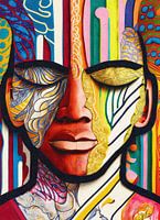 In een rustig dorpje, omgeven door een schilderachtig landschap, woonde een kunstenaar genaamd Maria. Op een dag vond ze een mysterieus doek met een gezicht waarvan de ogen gesloten waren, maar de rest van het gelaat straalde in alle kleuren van de regenboog.