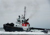 De sleepboot gaat vol in actie, het water slaat over het achterdek. Onderweg naar een nieuwe klus in de immense haven van Rotterdam beukt ze door het haven water van de Maasvlakte. Op de foto is haar brute kracht goed te zien — de romp snijdt door het water, schuim vliegt op, en het waterhaven lijkt te bruisen om haar heen.