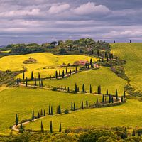 Een vierkante 1:1 foto gemaakt in de lente van de beroemde kronkelende met Cipressen omzoomde weg naar Agriturismo Podere Casanova nabij La Foce, gelegen in Toscane, midden-Italië.
