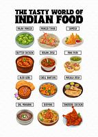 Deze kleurrijke illustratie toont een selectie van populaire Indiase gerechten. De titel "The Tasty World of Indian Food" staat prominent bovenaan. Daaronder staan twaalf gerechten, elk met een bijschrift. Ze omvatten Palak Paneer, Paneer Tikka, Samosa, Butter Chicken en Biryani. Elk gerecht is zeer gedetailleerd geïllustreerd en laat de diversiteit van de Indiase keuken zien, van hartige curry's en knapperige snacks tot pittige rijstgerechten.