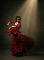 Dit beeld toont geen danspas, maar een incisie. Het lichaam van de danser fungeert als een mes dat de ruimte verdeelt - vastberaden, gecontroleerd, zonder aarzeling. De beweging wordt gestopt op het moment van de grootste spanning: de rok waaiert uit, niet decoratief, maar als gevolg van innerlijke noodzaak.