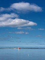 De sneldienst tussen Lauwersoog en Schiermonnikoog- De Vrijheid, in volle vaart op een verstilde Waddenzee richting het vaste land.