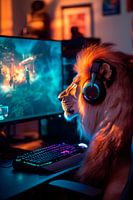Een majestueuze leeuw met koptelefoon, diep ondergedompeld in de digitale wereld, laat zijn indrukwekkende manen schitteren in het zachte licht. De monitor voor hem brengt fascinerende scenario's tot leven, terwijl een vleugje avontuur de lucht vult. Een uniek moment dat wildheid en technologie op een onderhoudende manier combineert.