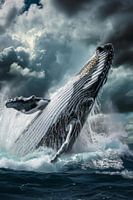 Te midden van een dramatische lucht rijst een majestueuze walvis op uit de bulderende golven. Zijn indrukwekkende contouren worden omringd door spetters water, terwijl het contrast tussen de donkere wolken en het gloeiende wateroppervlak voor een adembenemend schouwspel zorgt. Deze scène combineert de rauwe kracht van de natuur met de gratie van de zeereus.
