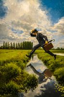 Dit schilderij toont een zorgvuldig gecomponeerd landschap waarin mens en omgeving in een spanningsvolle balans samenkomen. In het middelpunt van de compositie bevindt zich een man in maatpak met bolhoed, vastgelegd in het precieze moment waarop hij een sloot overspringt. In zijn rechterhand houdt hij zowel de handvatten van een aktetas…