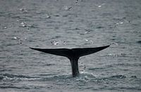 Spitsbergen, het grootste zoogdier van de wereld gaat rechtstandig naar het diepe zeewater daarbij gooit hij zijn staart in de lucht.