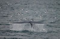 Spitsbergen, het grootste zoogdier van de wereld gaat rechtstandig naar het diepe zeewater daarbij gooit hij zijn staart in de lucht.
