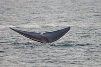 De Blauwe Vinvis in de Noordelijke IJszee bij Spitsbergen laat zijn staart zien voordat hij een een diepe duik maakt op zoek naar voedsel .